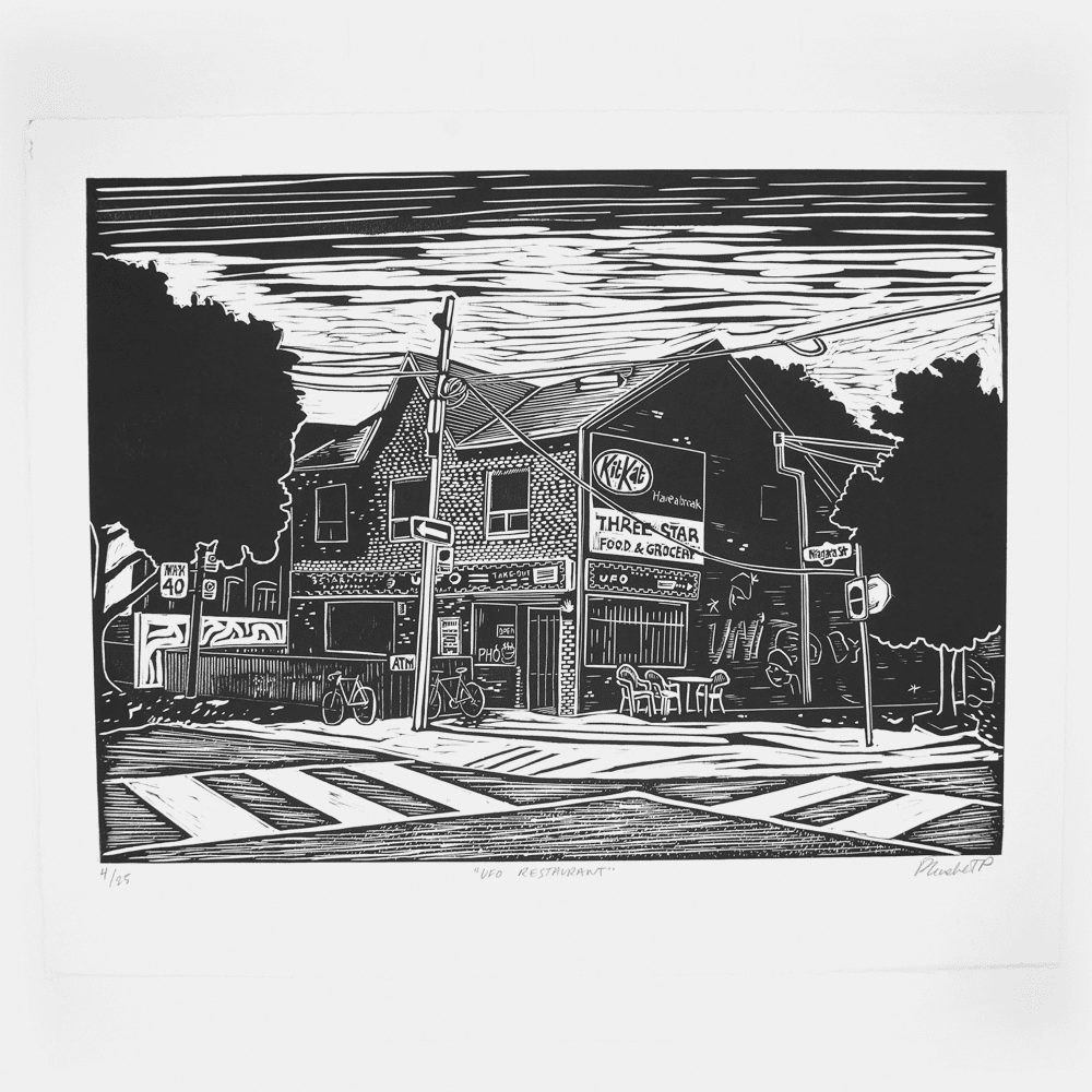 Flycatcher Press – PRINT – UFO Restaurant 15″ x 19″ Linocut Print